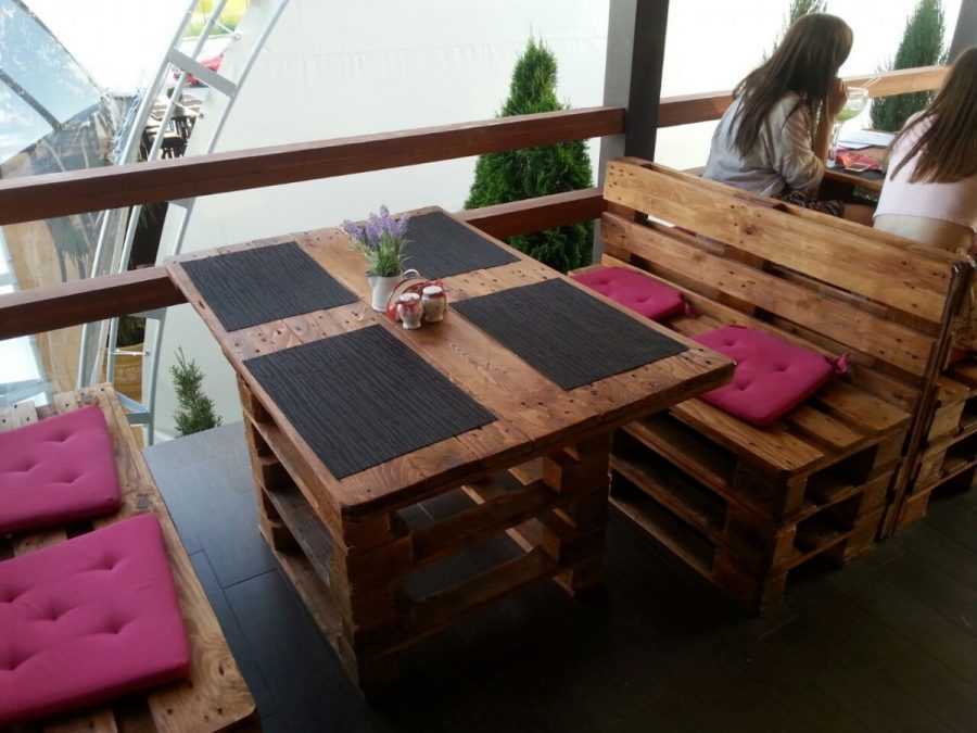 В дополнение к скамейке из поддонов делают столы или кресла. Если же составить несколько скамеек вместе, расположив их под прямым углом, то получится неплохая зона для проведения бесед, мастер-классов, да просто веселых посиделок. Существуют варианты, при которых скамейки разделяют высокой спинкой, устанавливают в барах, кафе.