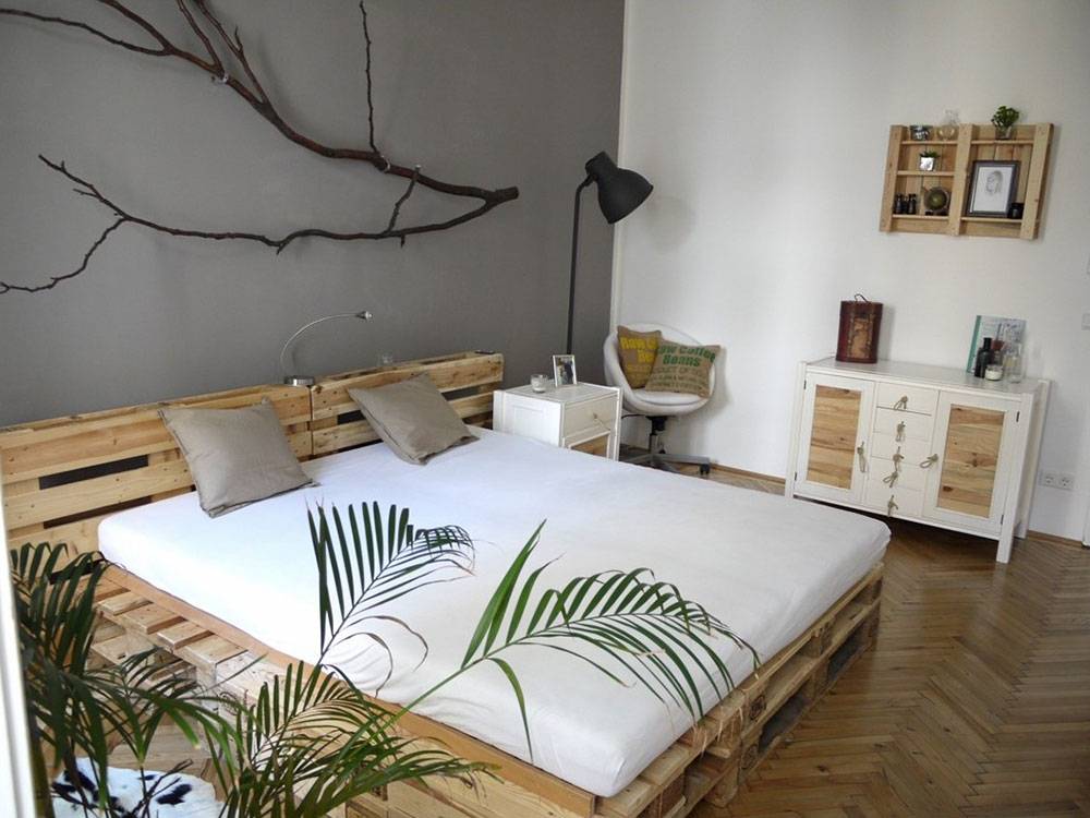 Кровать с изголовьем  | Часто в мебельных магазинах можно увидеть кровать с небольшим подголовником, который можно сделать и с помощью поддонов. Разумеется, не всем подходит такой дизайн, ведь он требует дополнительных затрат времени. |