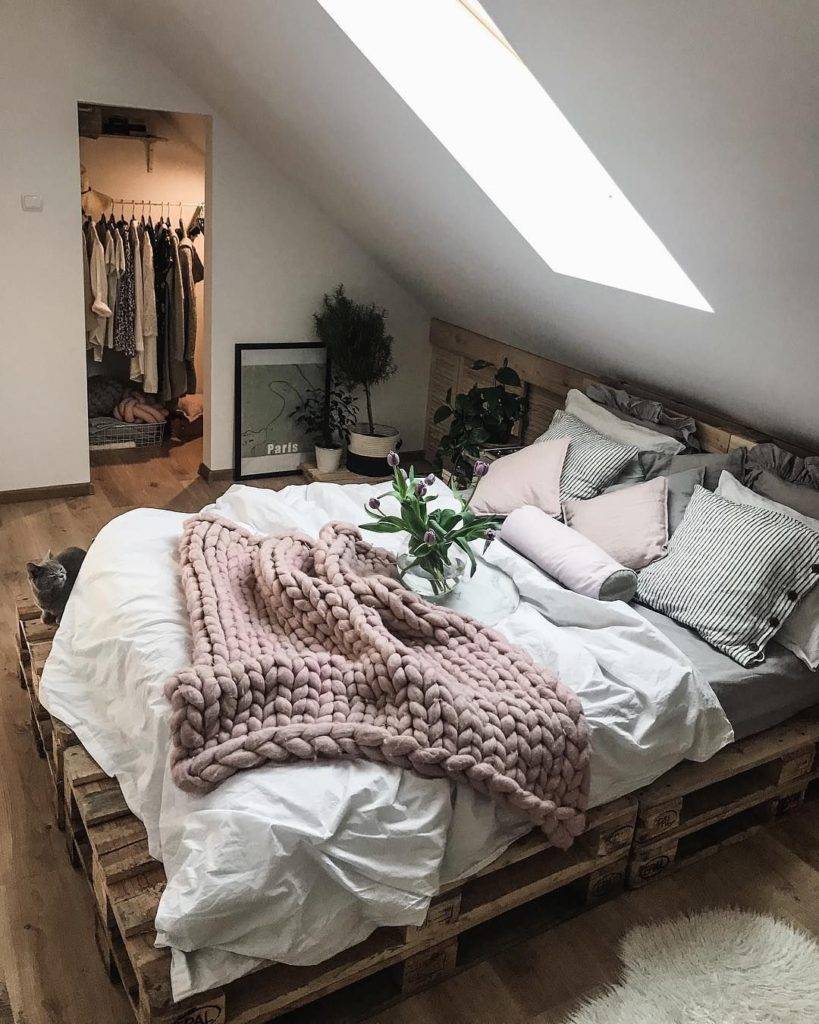 Уютная кровать тоже не доставит проблем при изготовлении. Всего-то надо установить несколько поддонов в ряд, на них водрузить второй такой же слой и скрепить все части.