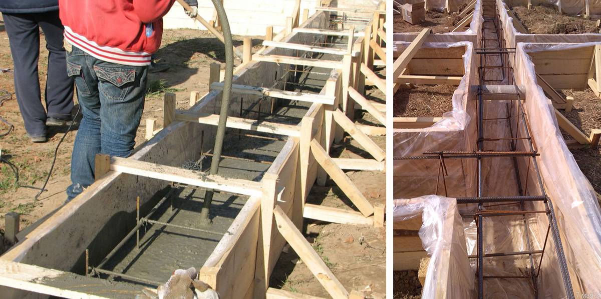 Так как высота фундамента мелкого заложения, лучше сформировать ленту за один заход. Так будет обеспечена монолитность без риска появления мостиков холода из-за расслоения. После окончания работ с раствором ленту накрывают пленкой. Спустя 2 недели можно убирать опалубку, через 4 продолжать строительство.