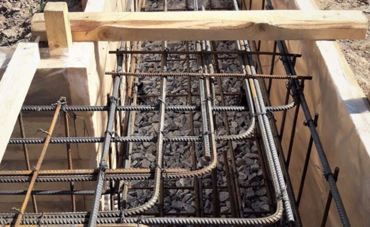 Ленту укрепляют арматурным каркасом. Рабочими считаются горизонтальные стержни, принимающие внешние нагрузки. Вертикальные играют вспомогательную роль. Вязку каркаса производят путём скрутки стальной проволокой. Стержни будут обладать подвижностью и компенсируют возникающие нагрузки (при заливке бетонного раствора или землетрясении). Сварка таких нагрузок не выдержит.