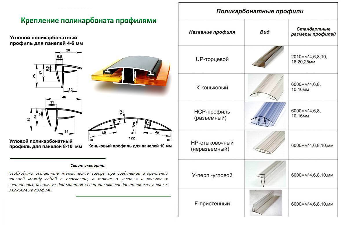 Для всех методов крепежа поликарбоната к металлу используют профили, причем они различаются по материалу изготовления и конфигурации: неразъемные, разъемные и торцевые.