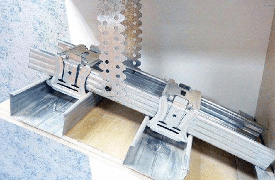 Все несущие профили монтируются с промежутком в 40 см. и фиксируются прямо на потолочном перекрытии. Уменьшение шага до 30 см. повышает прочность конструкции и защищает ее от растрескивания. Для повышения выносливости к нагрузке к ним присоединяются металлические кронштейны на расстоянии 60 см. по отношению друг к другу.