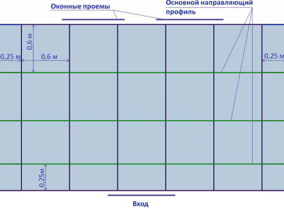 Это примерная схема разметки, основанная на том, что базовые направляющие профили должны располагаться поперек светового потока из окон. Это не обязательное условие, но чаще всего оно соблюдается.
