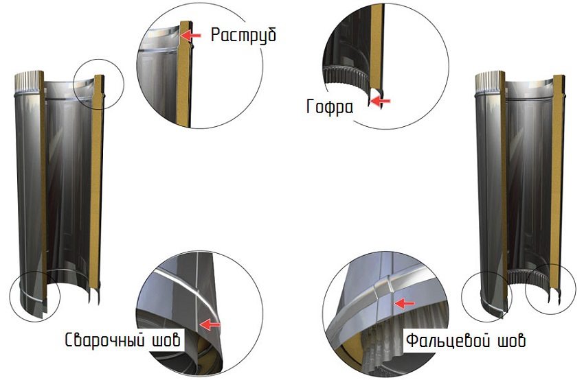 - Тип соединения. Элементы сэндвич труб соединяются двумя способами: гофрированными краями и раструбами. Достоинством гофрированного соединения является простота монтажа, но для обеспечения герметичности необходимо большое количество герметика, а это повышает стоимость дымохода. При раструбном соединении высокая степень герметичности достигается за счет наличия более широкой фаски с одной стороны трубы. Плюсом является высокая степень герметичности, благодаря чему конструкция может применяться для газовых котлов. А вот минус заключается в сложности монтажа и необходимости очень точного подгона всех деталей.