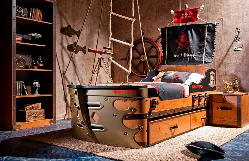 Морской стиль чаще можно встретить в детской комнате у мальчика, который декорируют в «пиратском стиле». Дети любят все необычное, и такой интерьер сможет стать не только отличной альтернативой скучному шаблонному решению, но также многие элементы декора будут крайне полезны для маленького мужчины. Аквариумные рыбки поспособствуют в развитие чувства ответственности, бинокль или подзорная труба пригодятся для познания окружающего мира, глобус и карты дальних стран – для развития географических знаний.