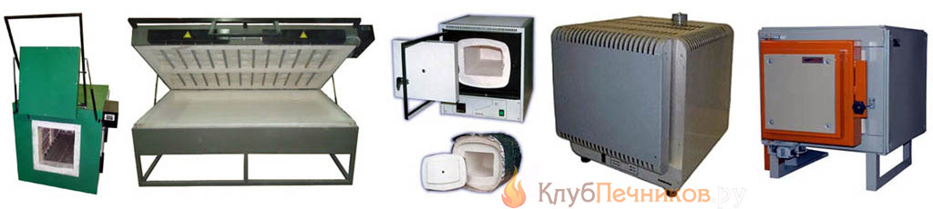 Из отечественных моделей «квартирной» мощности хорошо расходятся МИМП и «Накал», 2 правых поз. на рис. Они дешевле ПМ, купить б/у рабочую за 8-9 тыс. руб. вполне реально. Однако камеры их, похоже, изготавливаются методом спекания керамического порошка, поэтому для регулярной эксплуатации десятилетиями эти печки не предназначены. Впрочем, для эпизодического использования в домашней мастерской вполне подходят.
