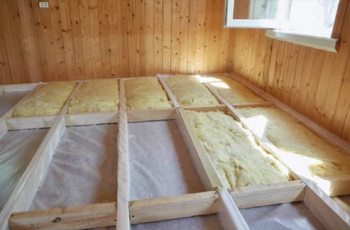 Но, еще надо утеплить пол. Для этого подойдет минеральная вата, ее укладывают в промежутки между лагами и закрывают гидроизоляционной пленкой. Ровную установку лаг проверяют уровнем, или сверяются со шнуром, который натягивают между двумя крайними досками.
