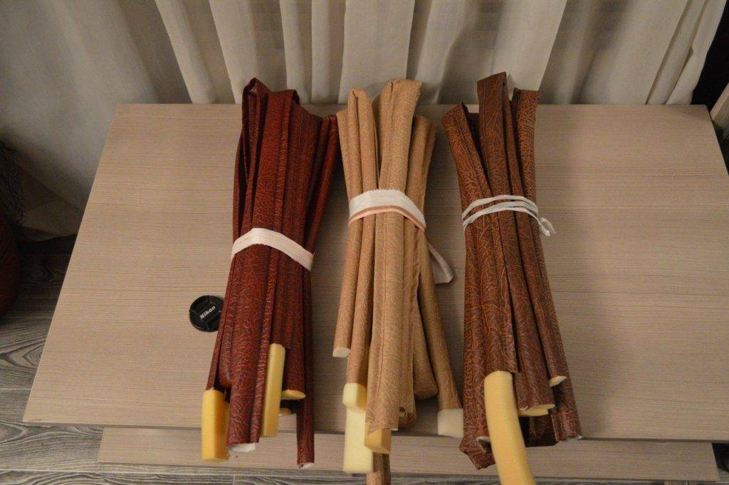 После этого можно приступать к формированию валика. Сначала нужно измерить длину верхнего и бокового торца двери. После это следует отрезать по полученным меркам длинные ленты кожи. Лучше всего, чтобы их ширина была 10 см. Кроме того, следует отрезать тонкие полосы подложки. Из нее изготавливается путем скручивания один длинный валик.