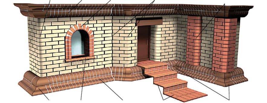 2. Фасонный вариант с разными профильными конфигурациями, предназначен для кладки сложных форм вокруг окон, подоконников, арок, столбов, заборов, беседок. Например, фасонные виды строительного кирпича с круглыми краями для углов, прекрасно подойдут для обустройства сложных фасадов зданий, а именно углов.