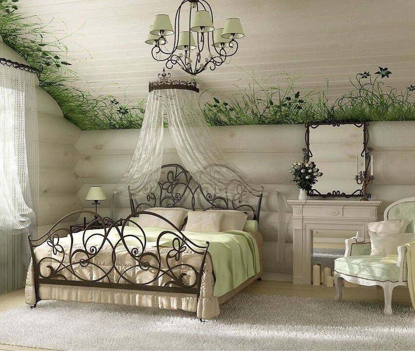 Стиль прованс – отличный выбор для спальни на даче. Тут можно использовать самые простые приемы. Для оформления подойдет текстиль с грубой текстурой, мебель из необработанного дерева, обладающая сколами и потертостями.