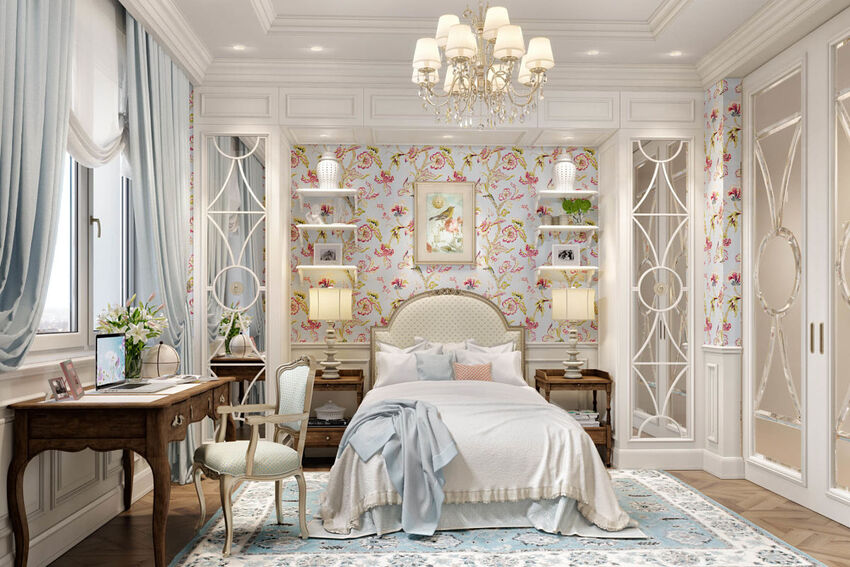 Лаконично и изящно будут украшать комнату в стиле прованс обои под штукатурку или с легким рисунком, например вензеля или полосы. Цвет в дизайн комнаты можно добавить при помощи текстиля и предметов декора.