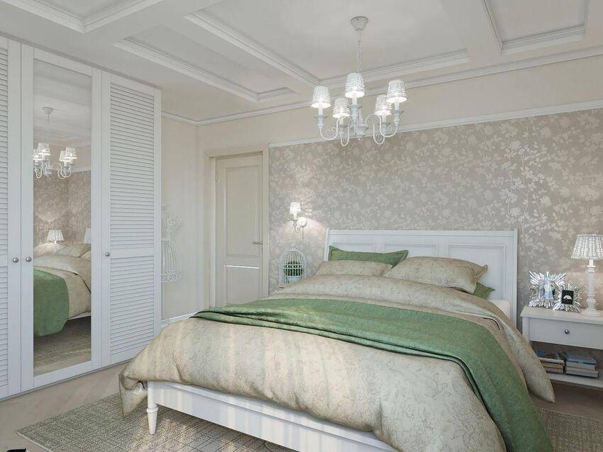 Если поместить в такой спальне большое зеркало, она будет казаться более просторной, потому что оно будет отражать все предметы в помещении и подарит ему аромат свежести.