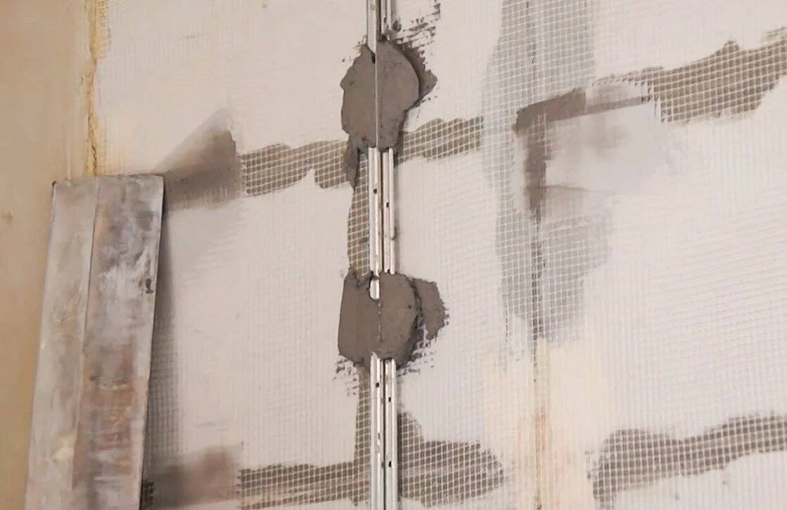 - Металлические профили являются универсальными. Их удобно устанавливать на так называемые «лепёшки», т.е. не замазывать их полностью клеем, а формировать по три-четыре опоры для каждого профиля. Это удобно и быстро, особенно если стена с сильно нарушенной геометрией и существуют большие перепады. Металлический профиль в этом случае отлично держит геометрию и не прогибается при оштукатуривании, что нельзя сказать о пластмассовых маяках. Их лучше в таких случаях не использовать