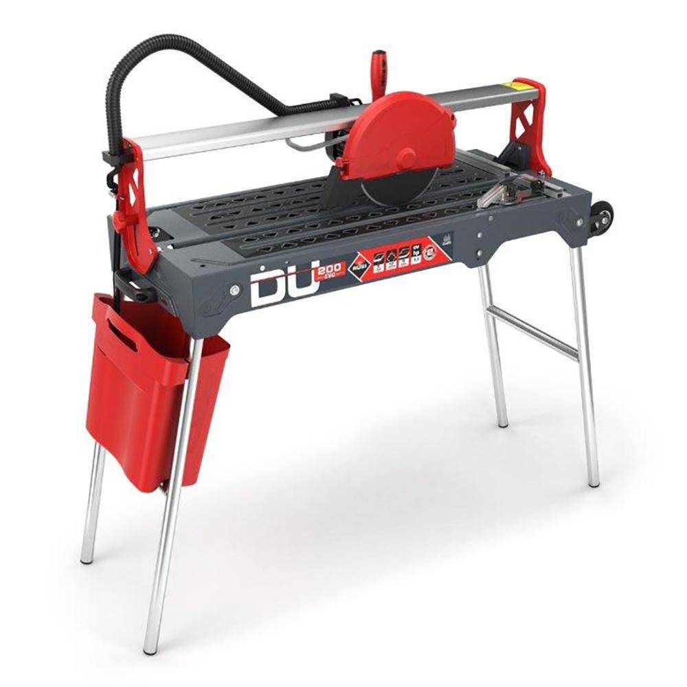 Водяное охлаждение, высокая мощность, 20-сантиметровый диск… Всё это есть в модели. Особенностью является верхнее расположение двигателя, при котором режущий блок перемещается по направляющей и разрезает разные виды керамических плиток. Пильный диск закрывается кожухом для исключения травмирующих ситуаций, защиты от пыли, искр, осколков.