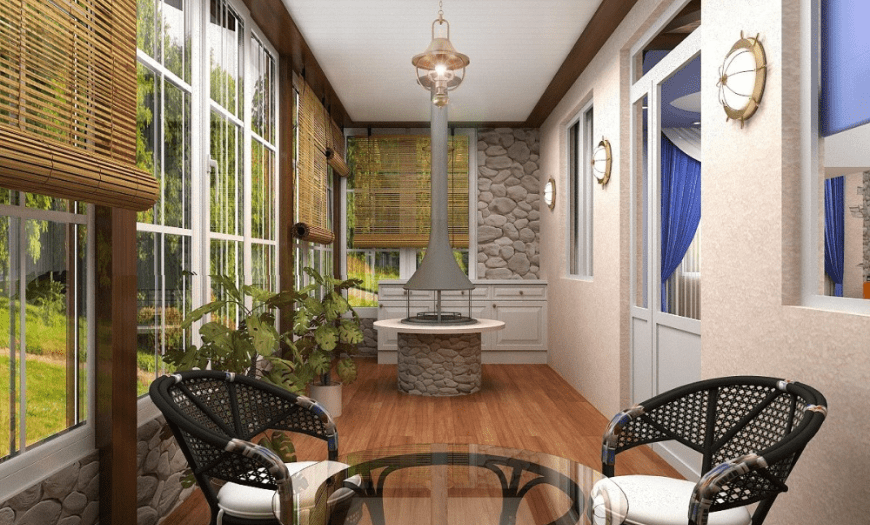 Когда балкон является продолжением жилой комнаты, его интерьер должен полностью сочетаться с ее оформлением. Если перепланировка не планируется, можно сделать авторский декор, добавить нотку оригинальности, необычные штрихи. Например, наклеить плитку, имитирующую натуральный камень, обить стенки деревом, украсить их витиеватой резьбой, повесить броские рольшторы.