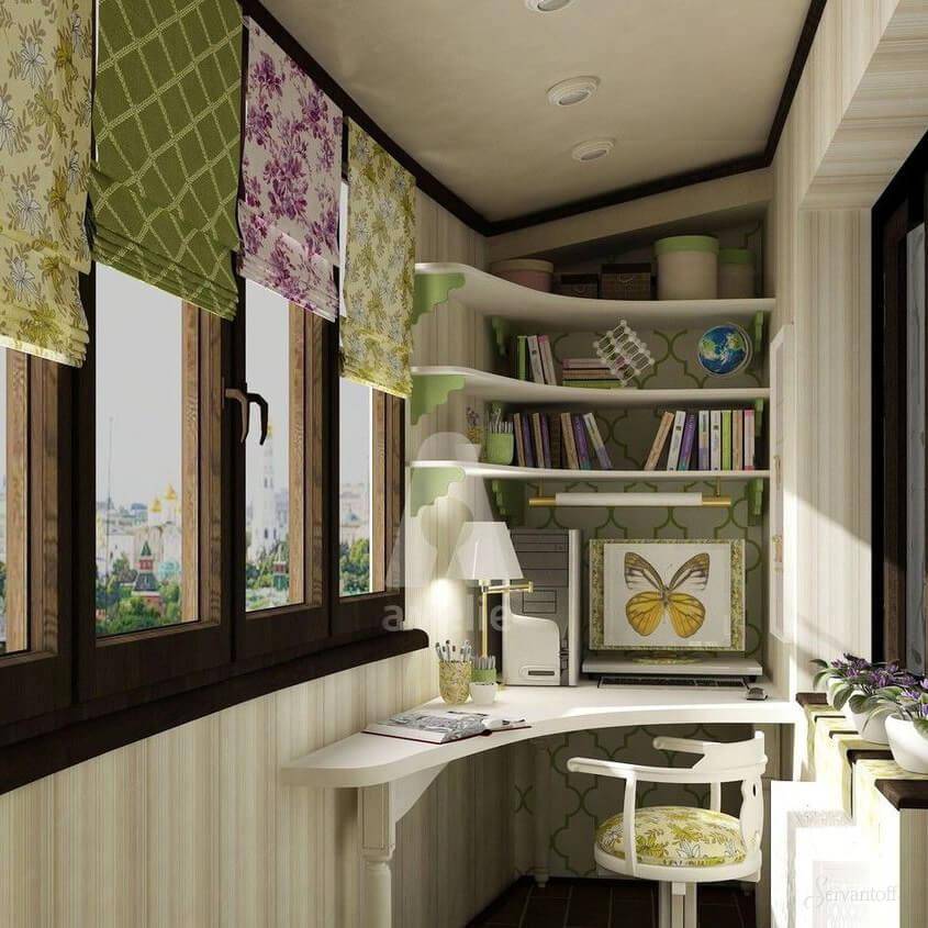 На лоджии можно разместить небольшой диван и стол. Для отделки стен отдается предпочтение лавандовым и бежевым оттенкам, также отлично смотрится приглушенный зеленый тон.