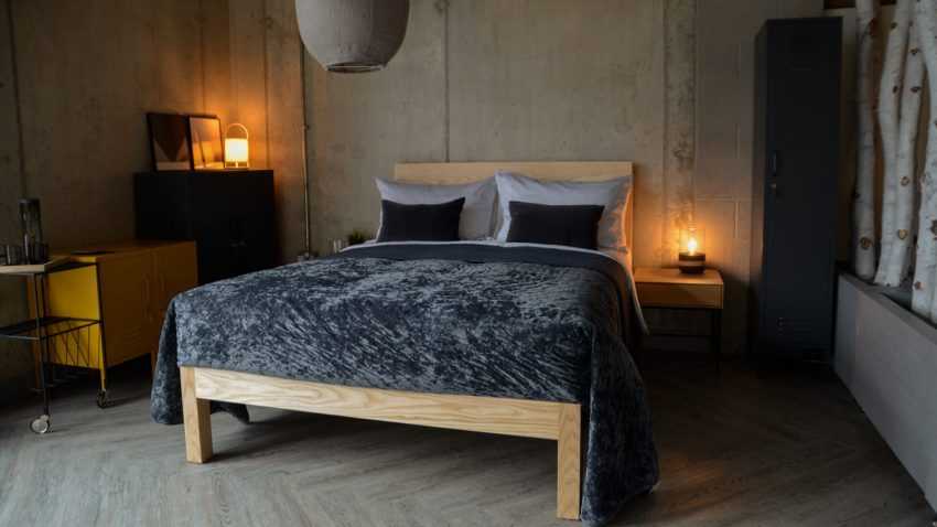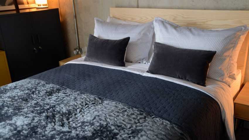 однотонное серое покрывало в спальне, оформленной в скандинавском стиле