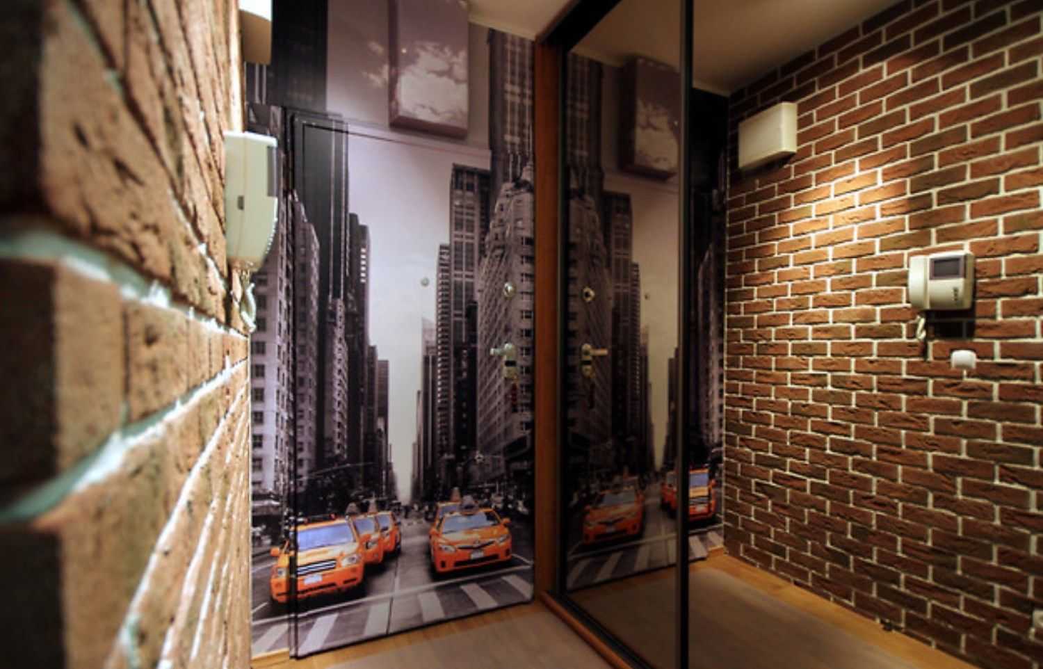 Ультрамодным оформлением стен прихожей является отделка под кирпичную кладку. Этот дух стиля лофт на удивление прекрасно «вписывается» в любой интерьер всей квартиры. Такая кладка может быть импровизирована на стеновых панелях, обоях или с помощью штукатурки.