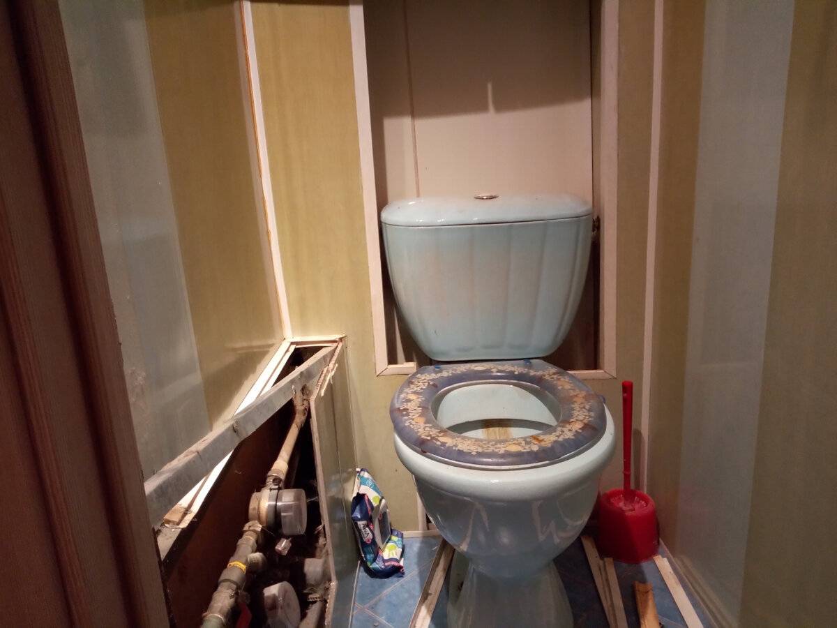 Изначально данный туалет уже был когда-то давно отделан панелями, поэтому для начала их пришлось разобрать, включая обрешетку из металлических профилей.