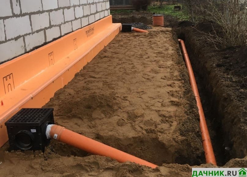 - Если покрытие потрескалось в результате усадки грунта – отмостку полностью демонтируют, заполняют траншею дренажом, укладывают арматуру, опалубку и гидроизоляцию, только после этого заливают основание.