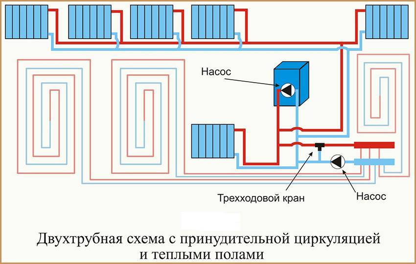 Даже двухтрубные схемы не откажутся от принудительной циркуляции – это обеспечит более быстрое наступление тепла по всему дому. Да и множество батарей без насоса малоэффективны.