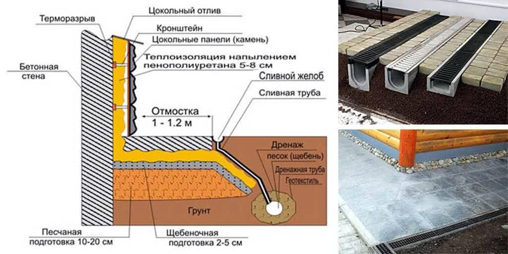 Теперь давайте узнаем, как правильно сделать, водосток вокруг отмостки, непосредственно ее и выпуск с крыши.