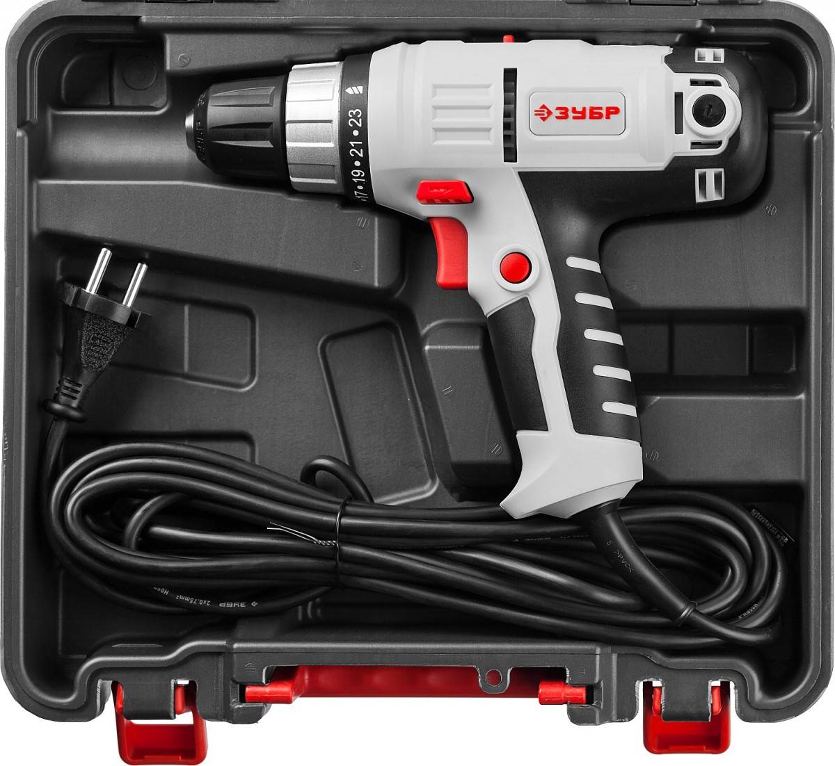 Весьма мощная модель сетевого шуруповерта 540 Вт, имеет максимально крутящийся момент — 42 Нм. Тип патрона здесь шестигранный, а выбор скорости ограничен — только один вид. Частота вращения набирается плавно от 0 до 1000. Вес изделия не превышает 1,3 кг, что весьма удобно при длительной работе. Корпус прочный, изготовленный из пластика с резиновой накладкой на рукоятке для антискольжения. Двигатель оснащён качественной системой охлаждения, поэтому можно не бояться его перегрева. Благодаря регулятору крутящегося момента его можно подбирать ступенчато от 4 д 42 Нм. Присутствует реверс, а в комплекте идет удобный и надежный кейс.