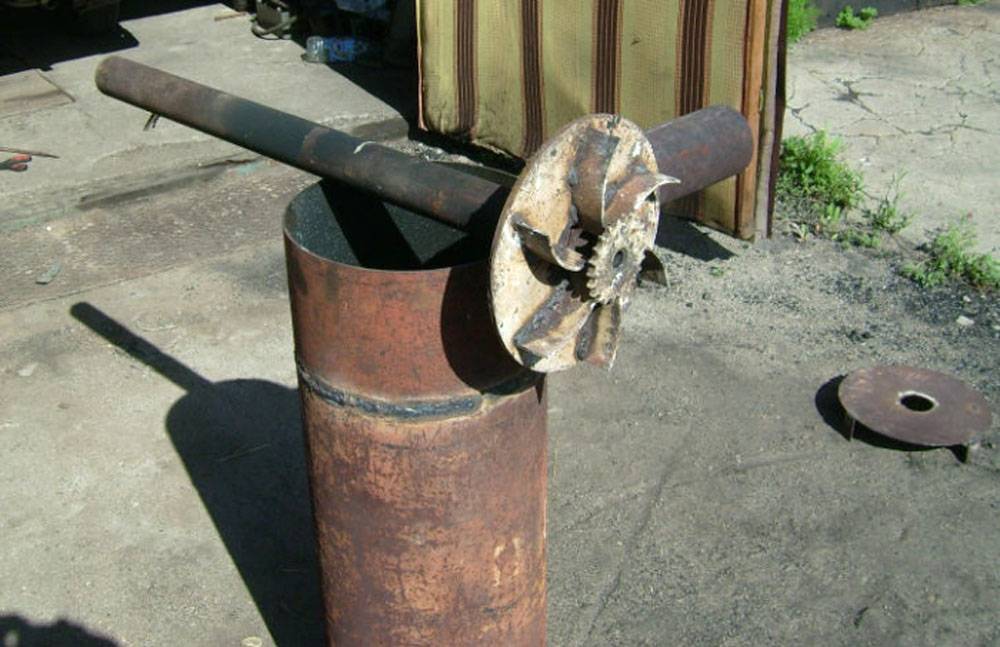 - Собирают нажимной поршень. Вырезают диск диаметром несколько меньшим внутреннего сечения корпуса. В центре делают отверстие для приварки воздуховода. К нижней части диска сваркой крепят пластины, формирующие зону горения. Сверху приваривают воздуховод.