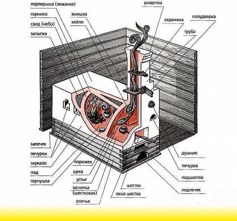 Особенно это важно, когда дом «пляшет» на пучинистом грунте при замерзании и оттаивании. В этом случае печь будет двигаться по собственной амплитуде вместе со своим фундаментом, не разрушая отделку и не влияя на стены и проёмы. Русская печка в разрезе во время протапливания и томленияИсточник 2proraba.com