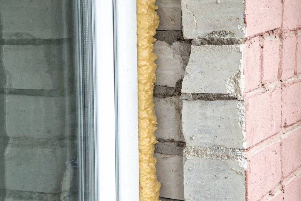 - Устранение малогабаритных неровностей, трещин, швов, полостей делают посредством монтажной пены. Например, при монтаже твёрдых утепляющих панелей, обустройстве фундамента, установке окон.