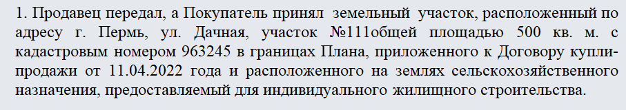 Правила составления передаточного акта к договору купли-продажи земельного участка содержат нижеприведенные пункты: