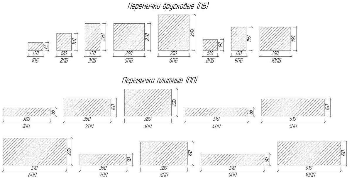 - Брусковые (ПБ) со стороной сечения не более 25 см. В зависимости от марки изделия, его длина может быть от 1030 до 5960 мм. Стандартизированная брусковая перемычка может иметь 10 разных длин, каждая из которых имеет два подвида с разной массой и системой армирования.