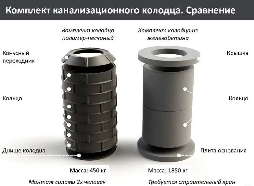 Размеры сегмента тоже имеют значение. Пластик предоставляет гораздо большую свободу в возможных размерах кольца, его высота может быть определена заказчиком и намного ниже железобетонных аналогов. В то время как бетонные аналоги производятся со стандартными размерами.