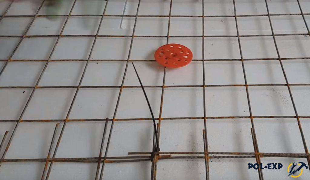 Шаг 4. На поверхность утеплителя укладывается армирующая сетка и крепится при помощи «грибков». Сетка укладывается с нахлестом в 1 ячейку, а отдельные полотна скрепляются друг с другом при помощи пластиковых хомутов.