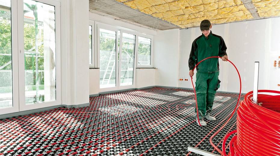 | Полимерные маты. Для решения значительной части проблем, связанных с теплопотерями, деформацией и намоканием поверх чернового настила можно также уложить полимерные маты с канавками для укладки труб. Функционируют они так же, как и фрезерованные панели из ДСП, но эффективность у этих изделий выше. Минус — высокая цена, которая компенсируется экономией на обогреве только частично. |