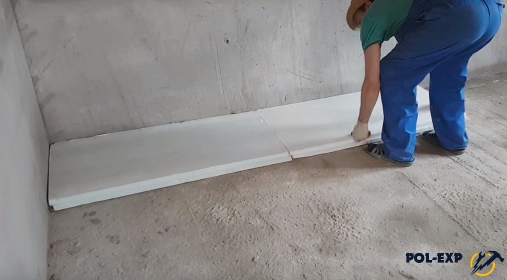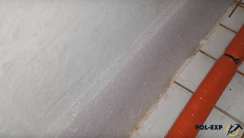 - По периметру помещения раскатывают и демпферную ленту. Это полоса теплоизоляционного материала, толщиной не более 1 см. Она предотвращает потери тепла на обогрев стен. Вторая ее задача — компенсировать температурное расширение, которое возникает при нагреве материалов. Лента может быть специальной, а еще можно уложить нарезанный полосами тонкий пенопласт (толщиной не более 1 см) или другой утеплитель такой же толщины.