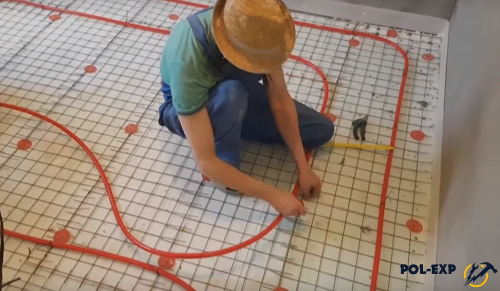 Шаг 7. В соответствии со схемой укладки труба для контура подогрева укладывается на армирующую сетку и закрепляется на ней при помощи пластиковых хомутов.
