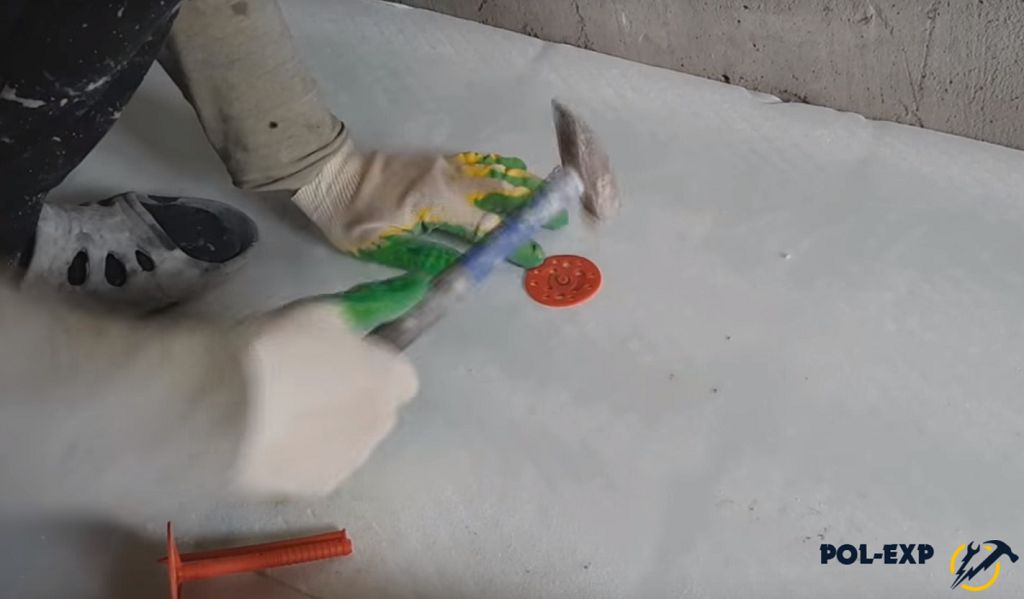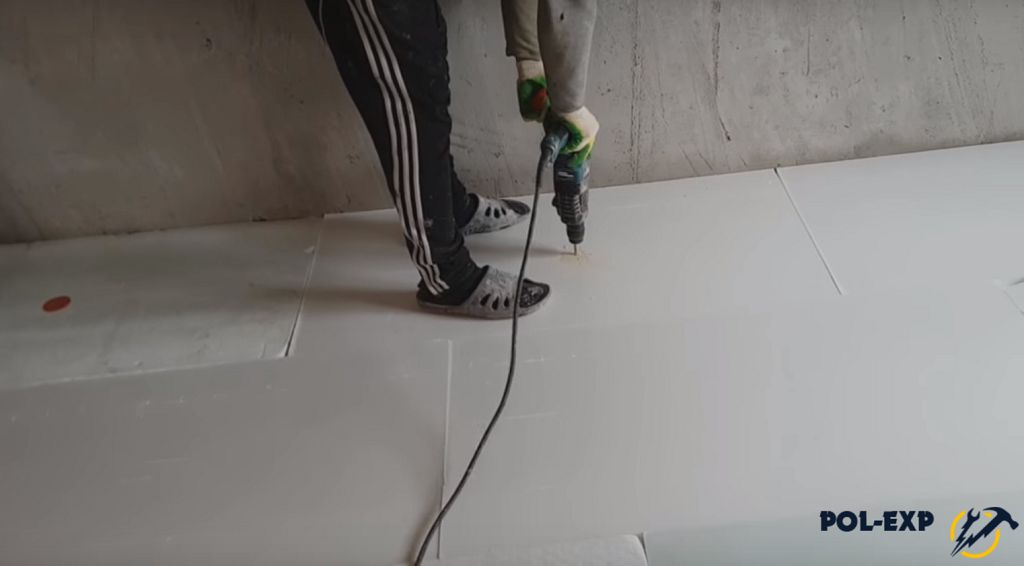Шаг 3. Плиты утеплителя закрепляются на полу при помощи специальных «грибков», отверстия для которых просверливаются мощной дрелью или перфоратором.