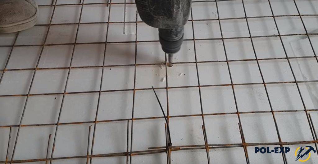 - Далее часто кладут армирующую сетку с шагом 5 см. К ней также привязывают трубы — проволокой или пластиковыми хомутами. Если использовался пенополистирол, можно обойтись без армирования — крепить можно специальными пластиковыми скобами, которые вгоняют в материал. Для других утеплителей армирующая сетка обязательна.