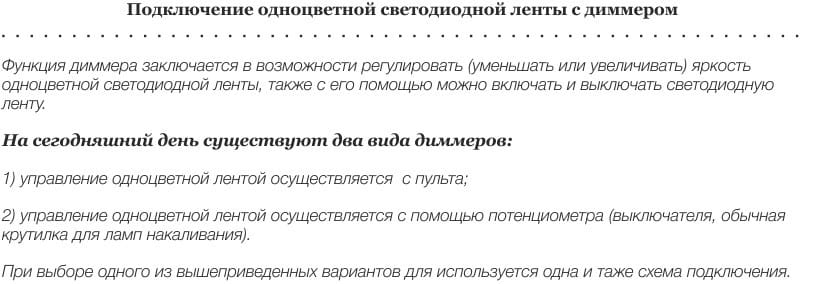 Элементарная схема сборки одноцветной осветительной системы состоит из таких элементов, как светодиодная полоса и блок питания. Последовательность выполнения работ: