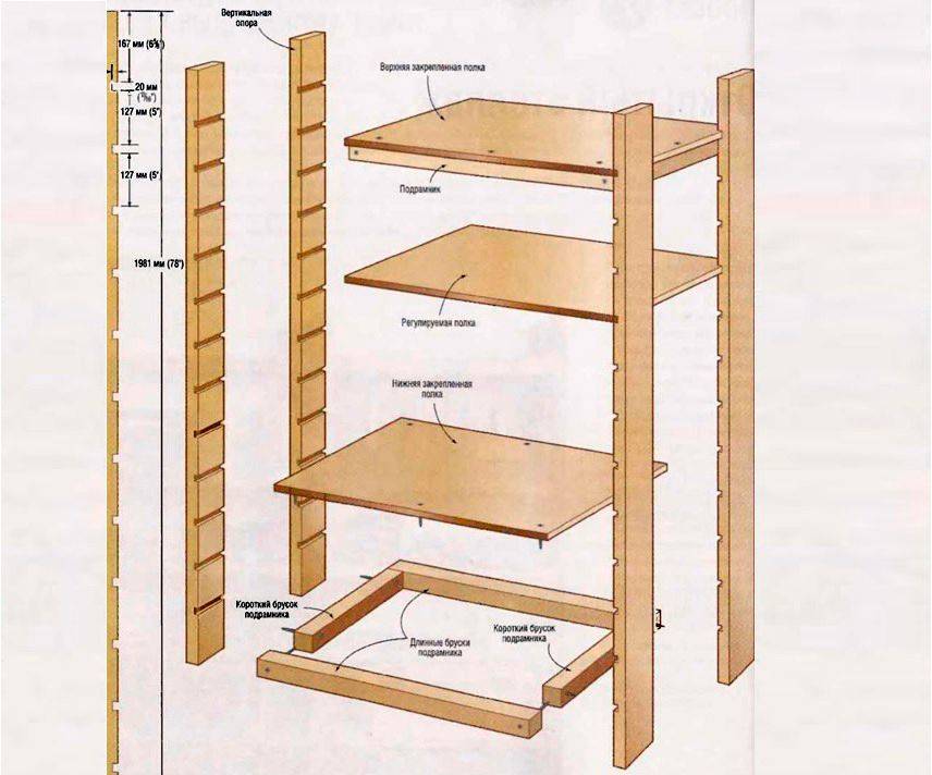 | Крепление поперечных деталей нужно проверять уровнем. Полки необязательно должны располагаться на одной плоскости. | |