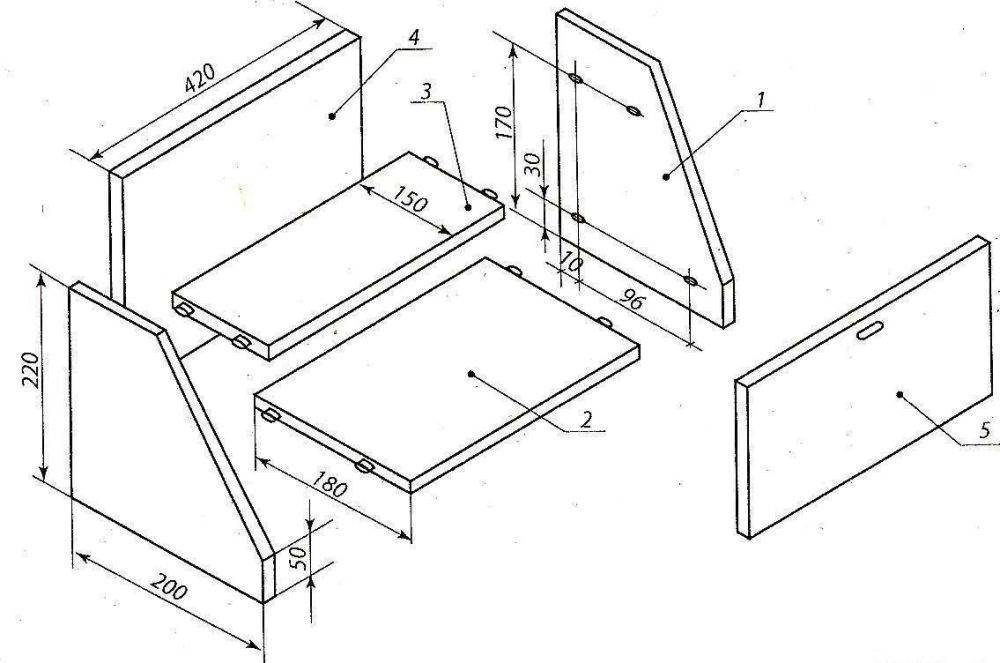| Для ровного распила досок используйте лобзик. Все детали вырезаются после предварительных замеров в соответствии с чертежом. | |