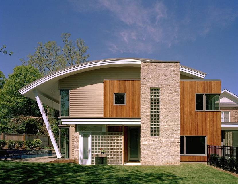 Сводчатая (арочная) крыша может проектироваться над мансардным помещением, холлом, зимним садом или входом. В основе помещают несущую конструкцию, выполненную из металла, бетона или дерева. Покрытием служит оцинкованная сталь, гонт (дранка), стекло, поликарбонат, прозрачный шифер. Такое решение практично и оригинально; покрытие устойчиво к ветру, а использование прозрачного материала позволяет экономить электроэнергию.