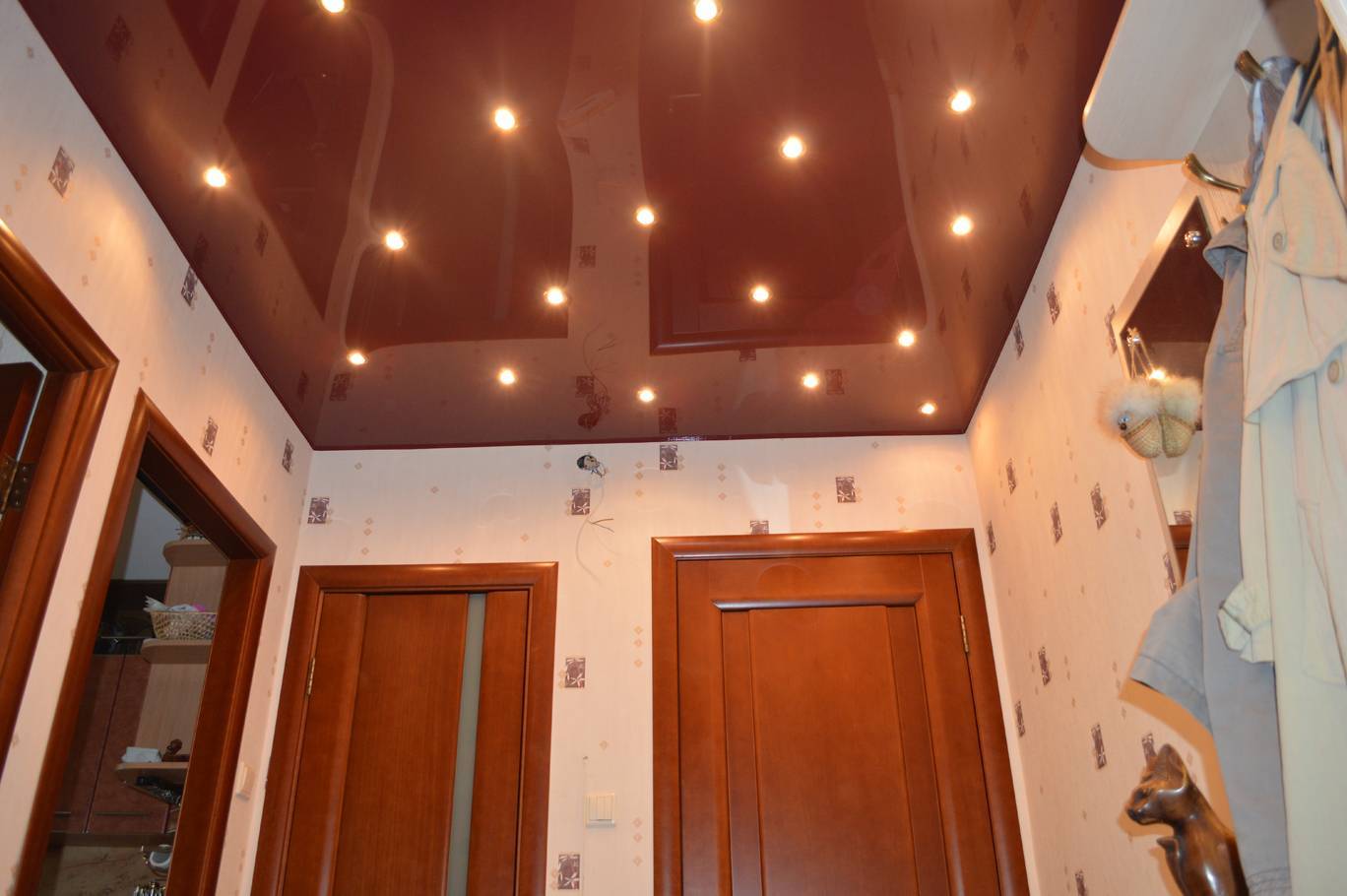 При использовании навесного натяжного потолка сделайте выбор в пользу глянцевого материала, обладающего легким зеркальным эффектом. Такие покрытия визуально расширяют пространство и наполняют его светом.