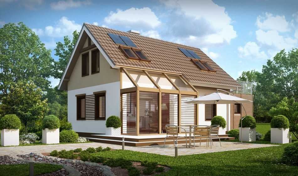 Затейливый декор, мансардные окна и просторная терраса в доме скромных размеровИсточник stroy-podskazka.ru