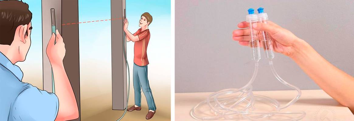 Гидроуровни представляют собой трубку с водой. На ее концах находятся колбы, которые выполняют роль контрольных точек. Трубка становится шкалой ориентира на горизонт. Жидкость показывает, насколько предметы и плоскости отклонены от эталонной линии.