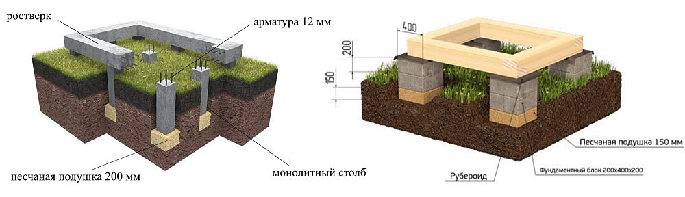 Как можно догадаться из названия, рассматриваемый вид фундамента состоит из столбов. Они образуют опорную сеть, проходящую в местах возведения несущих стен. На опору монтируется обвязка.