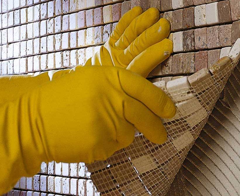 Сначала на стену укладывается фоновый кафель мозаики, разрезать плитку на мелкие кусочки можно при помощи строительного ножа. На стену наносится клей толщиной до 10 мм (чем толще материал, тем больше клея нужно нанести). Плитку плотно прижимать к стене по отмеченному трафарету. Постукивать по поверхности шпателем, чтобы обеспечить лучшее сцепление.