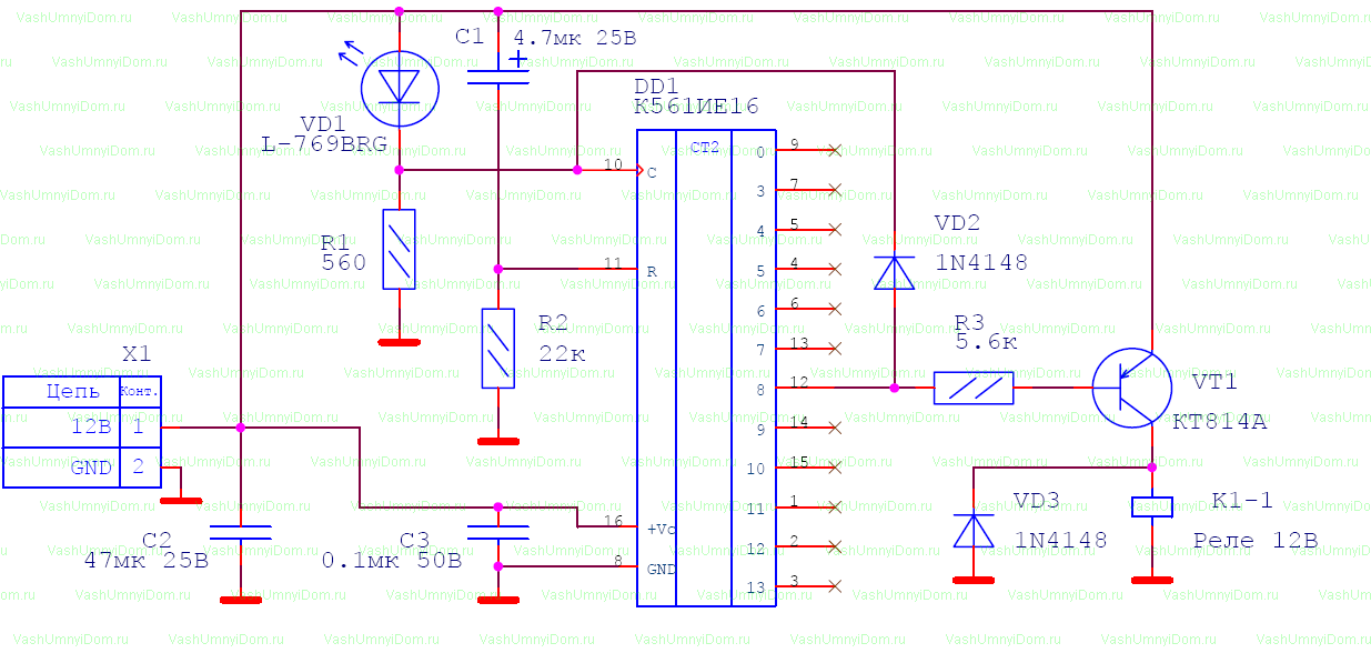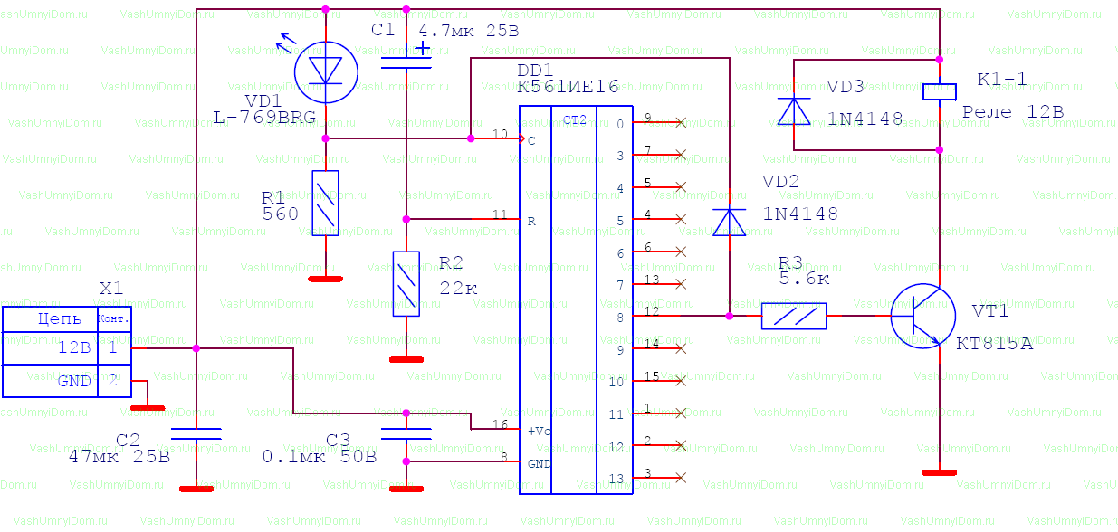 Транзистор, подсоединенный к выходу интегрального счетчика, открывается и подает напряжение 12В на катушку реле, через силовые контакты которого замыкается цепь включения нагрузки.